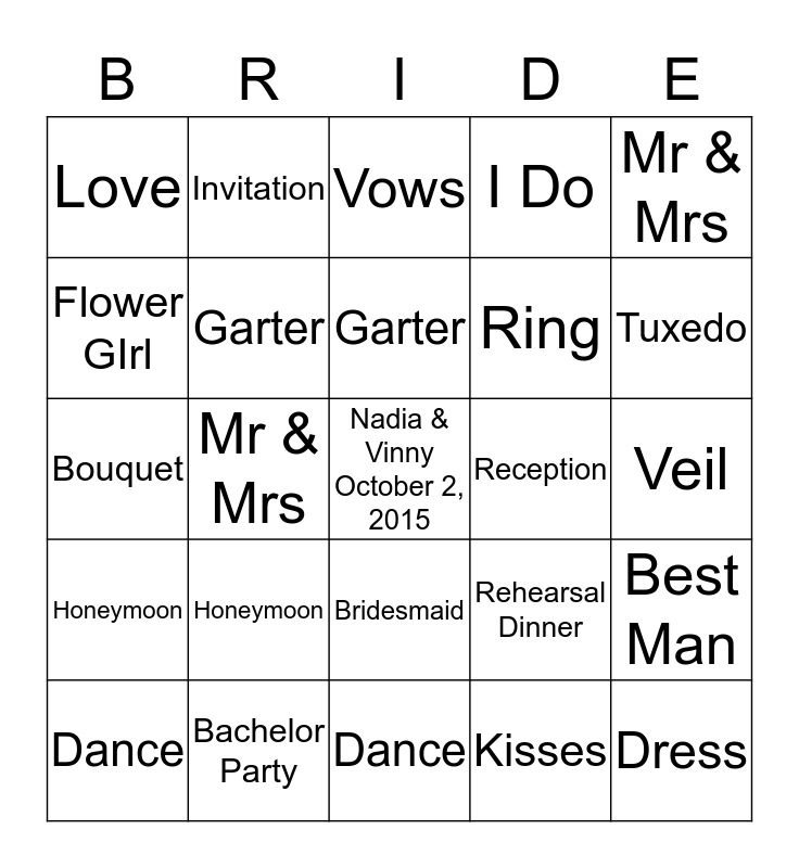 ⚠ This card has duplicate items: Honeymoon (2), Garter (2), Dance (2), Mr & Mrs (2)