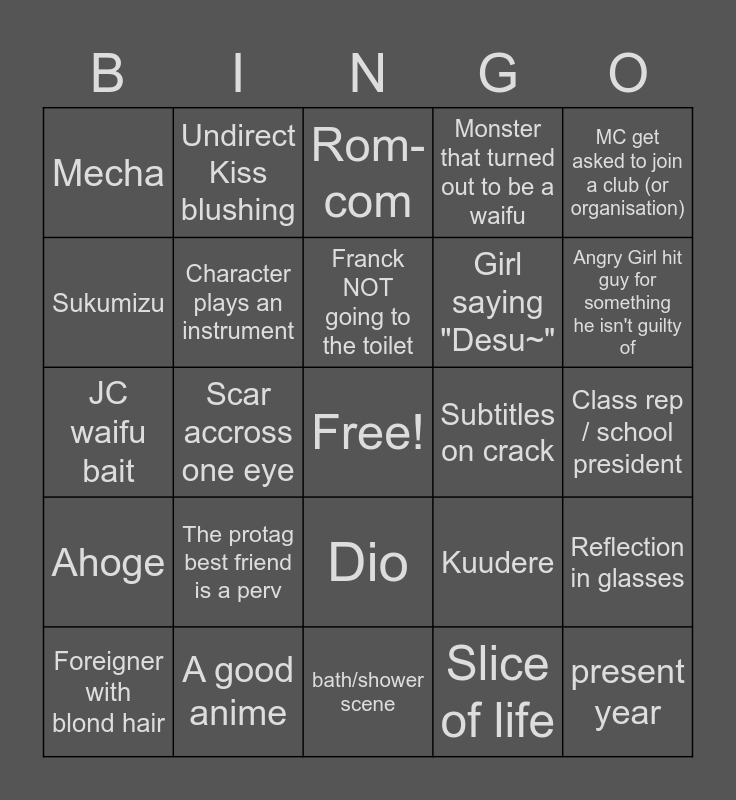 This bingo card has a free space and 24 words: The protag best friend is a perv, A good anime, Franck NOT going to the toilet, Foreigner with blond hair, MC get asked to join a club (or organisation), Mecha, Sukumizu, Undirect Kiss blushing, Subtitles on crack, Dio, Girl saying "Desu~", JC waifu bait, Kuudere, Reflection in glasses, Character plays an instrument, Slice of life, Class rep / school president, Rom-com, Angry Girl hit guy for something he isn't guilty of, Scar accross one eye, present year, Ahoge, Monster that turned out to be a waifu and bath/shower scene.