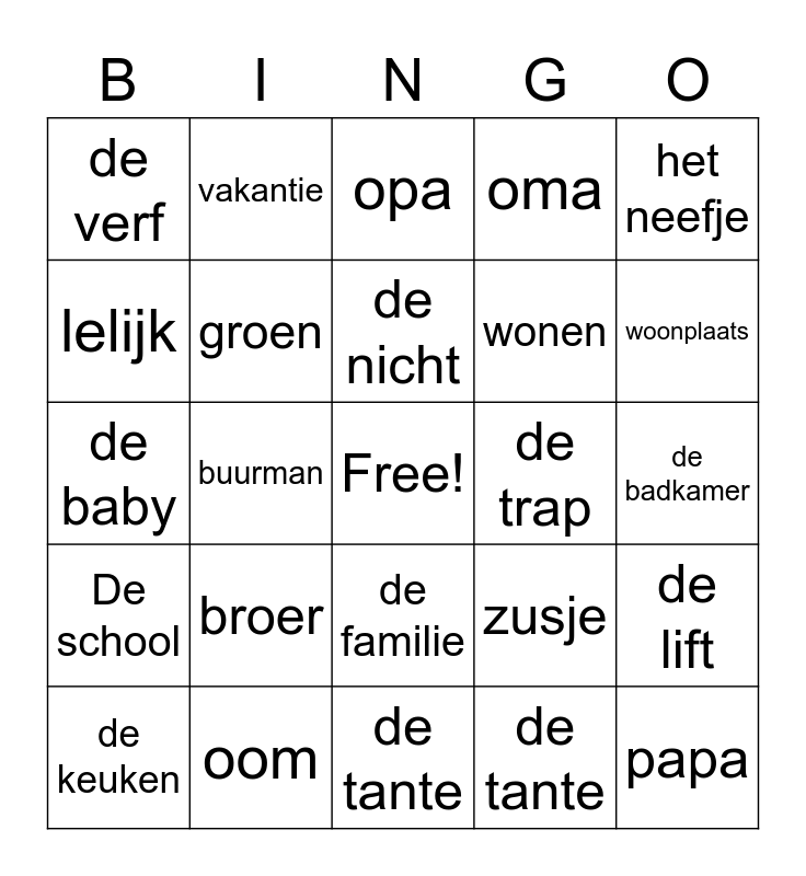 This bingo card has a free space and 34 words: de stoel, de tante, het kleed, het gezin, De school, groen, het neefje, de keuken, vakantie, mooi, de nicht, opa, oog, kleuren, de trap, woonplaats, oom, de baby, broer, zusje, de familie, vader, de verf, de badkamer, de tante, papa, oma, de trap, wonen, lelijk, grootvader, buurman, de lift and kapot.