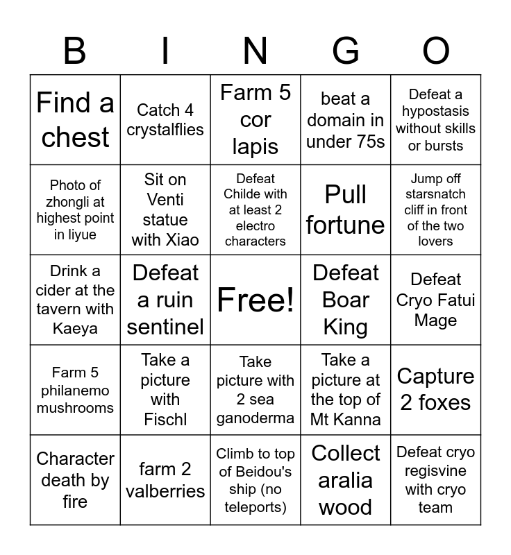 This bingo card has a free space and 24 words: Take a picture with Fischl, farm 2 valberries, Defeat Childe with at least 2 electro characters, Character death by fire, Defeat a hypostasis without skills or bursts, Find a chest, Photo of zhongli at highest point in liyue, Catch 4 crystalflies, Defeat Boar King, Take picture with 2 sea ganoderma, Pull fortune, Drink a cider at the tavern with Kaeya, Take a picture at the top of Mt Kanna, Capture 2 foxes, Sit on Venti statue with Xiao, Collect aralia wood, Defeat Cryo Fatui Mage, Farm 5 cor lapis, Jump off starsnatch cliff in front of the two lovers, Defeat a ruin sentinel, Defeat cryo regisvine with cryo team, Farm 5 philanemo mushrooms, beat a domain in under 75s and Climb to top of Beidou's ship (no teleports).