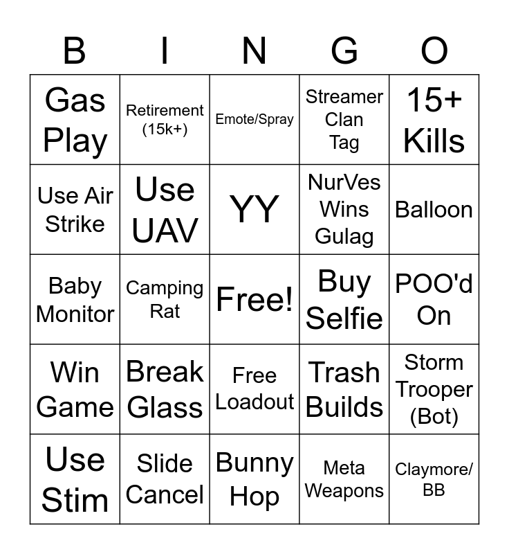 This bingo card has a free space and 24 words: Break Glass, Slide Cancel, YY, Use Stim, 15+ Kills, Gas Play, Use Air Strike, Retirement (15k+), Buy Selfie, Free Loadout, NurVes Wins Gulag, Baby Monitor, Trash Builds, Storm Trooper (Bot), Use UAV, Meta Weapons, POO'd On, Emote/Spray, Balloon, Camping Rat, Claymore/ BB, Win Game, Streamer Clan Tag and Bunny Hop.