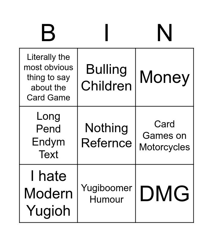 This bingo card has a free space and 8 words: Card Games on Motorcycles, Money, Bulling Children, I hate Modern Yugioh, Literally the most obvious thing to say about the Card Game, DMG, Long Pend Endym Text and Yugiboomer Humour.