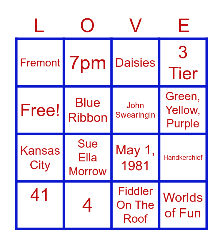 This bingo card has 16 words: 4, Handkerchief, Daisies, Fremont, Kansas City, 7pm, May 1, 1981, Fiddler On The Roof, Free!, Blue Ribbon, 41, 3 Tier, Sue Ella Morrow, Green, Yellow, Purple, John Swearingin and Worlds of Fun.