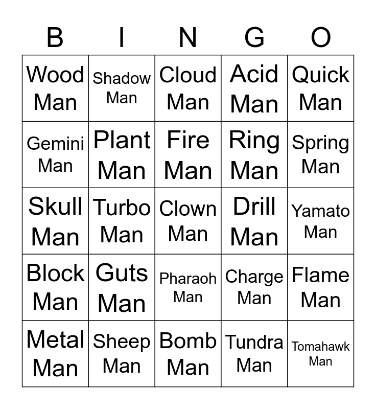 This bingo card has 25 words: Guts Man, Bomb Man, Fire Man, Metal Man, Quick Man, Wood Man, Gemini Man, Shadow Man, Drill Man, Pharaoh Man, Ring Man, Skull Man, Charge Man, Flame Man, Plant Man, Tomahawk Man, Yamato Man, Cloud Man, Spring Man, Turbo Man, Clown Man, Sheep Man, Block Man, Acid Man and Tundra Man.