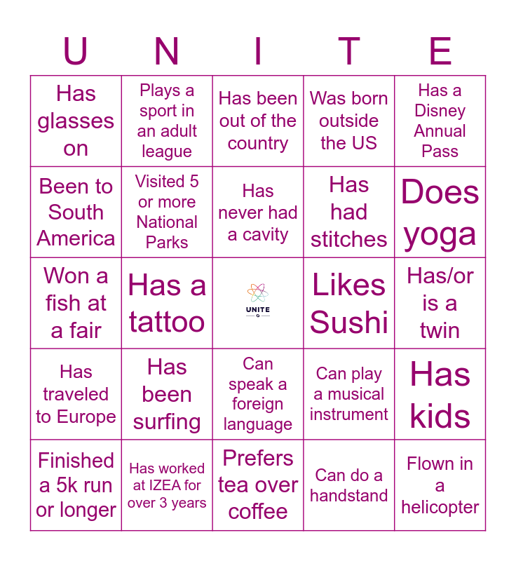 This bingo card has a free space and 70 words: Was an intern at IZEA, Has/or is a twin, Got married in 2022 (or is getting married), Is an only child, Has worked at IZEA for over 3 years, Is an influencer, Was born outside the US, Has lived in Florida their entire life, Has a Disney Annual Pass, Has blue eyes, Has kids, Has brown eyes, Has glasses on, Has been out of the country, Knows how to sew, Has a tattoo, Can speak a foreign language, Has had stitches, Has never gotten a speeding ticket, Has traveled to Europe, Likes Sushi, Can play a musical instrument, Does yoga, Can juggle, Is a lefty, Has been on TV, Has a green thumb, Has been camping, Can do a handstand, Favorite food is Italian, Plays a sport in an adult league, Broken a bone, Has blonde hair, Climbed a mountain, Has been whitewater rafting, Likes Roller Coasters, Favorite music is Country, Been to Las Vegas, Won over $100 on a scratch off ticket, Been to South America, Has been to a live professional sporting event, Has been surfing, Flown in a helicopter, Drove a Jet Ski, Has caught a fish, Visited 5 or more National Parks, Finished a 5k run or longer, Has changed a tire, Favorite color is red, Was a member of a sorority or fraternity, Has been to Hawaii, Has been scuba diving, Has 3 or more animals, Has all 4 wisdom teeth, Prefers tea over coffee, Put’s salt on Watermelon, Has never had a cavity, Rode a horse, Bakes from scratch, Been on a ferris wheel, Won a fish at a fair, Has eaten a funnel cake, Has been skydiving, Has Ziplined, Entered a contest & Won, Built a snowman, Sings in the shower, Been to Australia, Milked a cow and Can do a backflip.