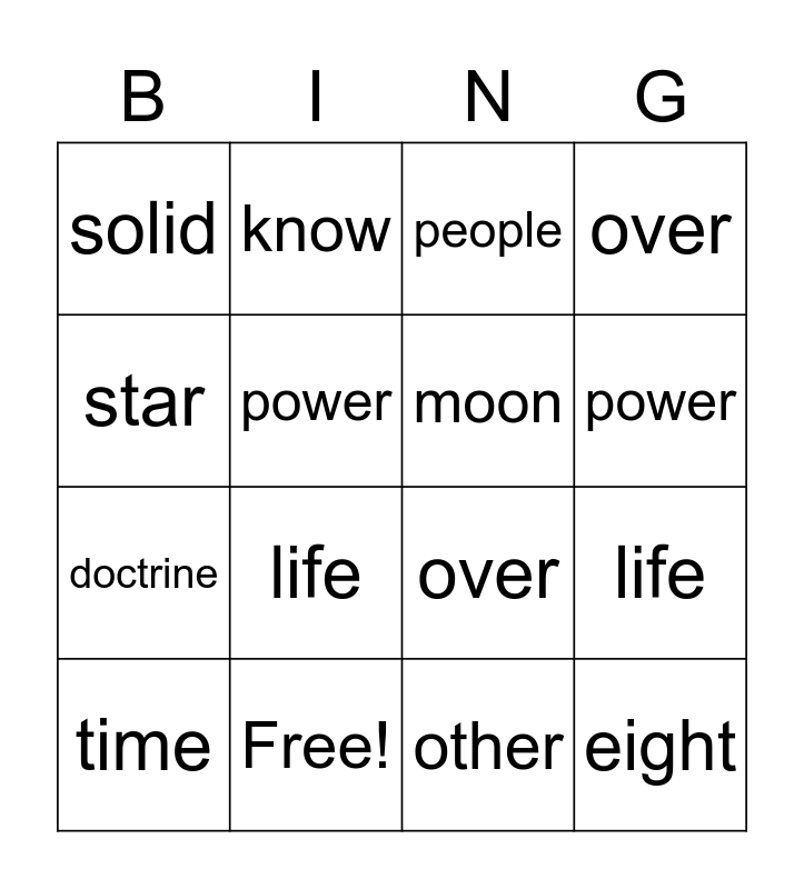 This bingo card has 16 words: Free!, life, people, solid, doctrine, know, over, other, star, power, time, over, life, power, moon and eight.