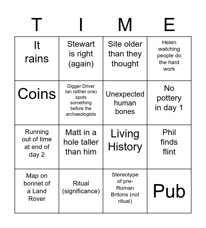 This bingo card has 16 words: Ritual (significance), Phil finds flint, Site older than they thought, It rains, Running out of time at end of day 2, Stewart is right (again), Living History, Stereotype of pre-Roman Britons (not ritual), Coins, Digger Driver Ian (either one) spots something before the archaeologists, Map on bonnet of a Land Rover, Helen watching people do the hard work, Matt in a hole taller than him, No pottery in day 1, Unexpected human bones and Pub.