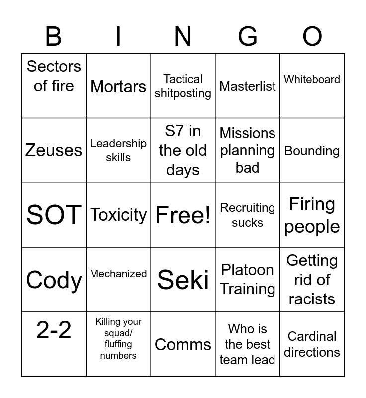 This bingo card has a free space and 24 words: Mechanized, Killing your squad/ fluffing numbers, S7 in the old days, 2-2, Whiteboard, Sectors of fire, Zeuses, Mortars, Recruiting sucks, Seki, Missions planning bad, SOT, Platoon Training, Getting rid of racists, Leadership skills, Who is the best team lead, Firing people, Tactical shitposting, Bounding, Toxicity, Cardinal directions, Cody, Masterlist and Comms.