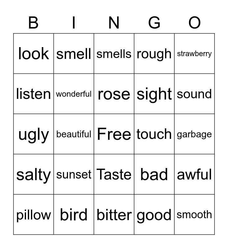This bingo card has a free space and 24 words: sunset, bird, rose, pillow, strawberry, look, listen, smell, touch, Taste, sight, ugly, bad, awful, wonderful, good, garbage, smells, sound, beautiful, smooth, salty, rough and bitter.