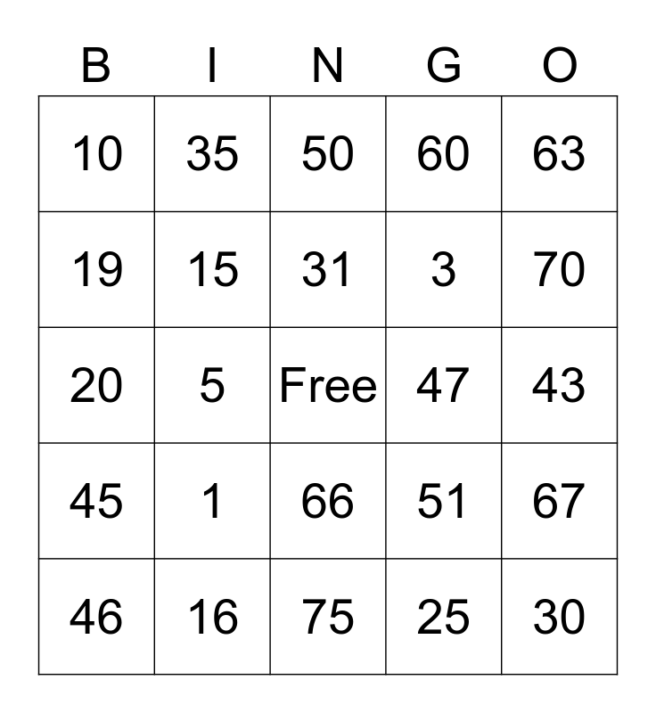 This bingo card has a free space and 24 words: 1, 16, 31, 46, 63, 10, 19, 35, 47, 66, 3, 20, 51, 67, 15, 25, 43, 50, 70, 5, 30, 45, 60 and 75.