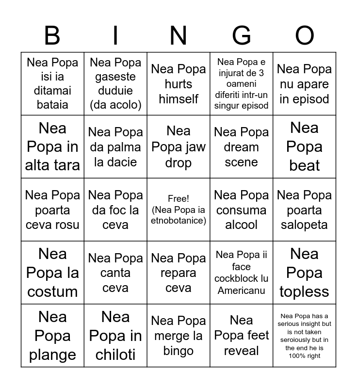 This bingo card has a free space and 24 words: Nea Popa canta ceva, Nea Popa in chiloti, Nea Popa jaw drop, Nea Popa plange, Nea Popa nu apare in episod, Nea Popa isi ia ditamai bataia, Nea Popa in alta tara, Nea Popa gaseste duduie (da acolo), Nea Popa consuma alcool, Nea Popa repara ceva, Nea Popa dream scene, Nea Popa poarta ceva rosu, Nea Popa ii face cockblock lu Americanu, Nea Popa topless, Nea Popa da palma la dacie, Nea Popa feet reveal, Nea Popa poarta salopeta, Nea Popa hurts himself, Nea Popa beat, Nea Popa da foc la ceva, Nea Popa has a serious insight but is not taken seroiously but in the end he is 100% right, Nea Popa la costum, Nea Popa e injurat de 3 oameni diferiti intr-un singur episod and Nea Popa merge la bingo.