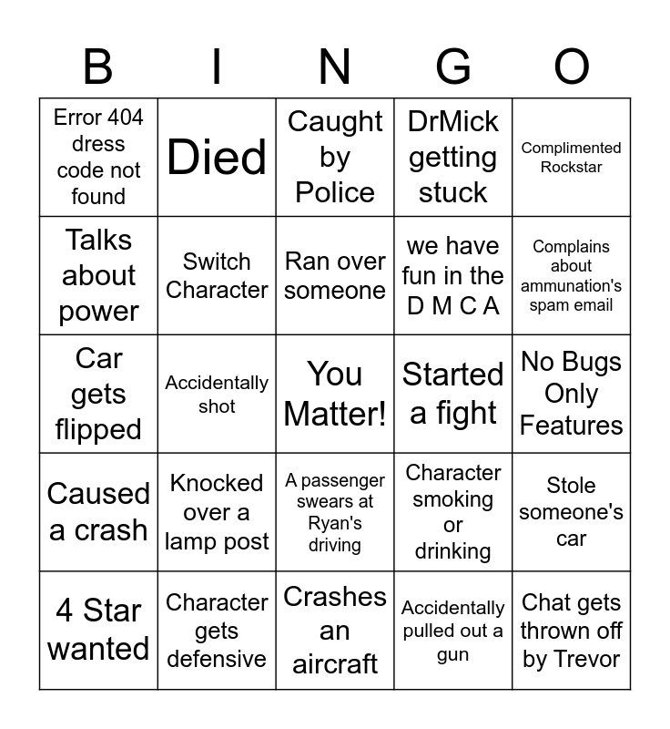 This bingo card has a free space and 32 words: Accidentally pulled out a gun, Mission Failed, Accidentally shot, Wanted, Caused a crash, Switch Character, Complimented Rockstar, Stole someone's car, Died, Off roading, Ran over someone, Caught by Police, Lost the police, Ran over by someone, Started a fight, Kills a cop, 4 Star wanted, Car gets flipped, A passenger swears at Ryan's driving, Knocked over a lamp post, Character smoking or drinking, DrMick starts eavesdropping, No Bugs Only Features, Character gets defensive, Chat gets thrown off by Trevor, DrMick getting stuck, we have fun in the D M C A, Talks about power, Error 404 dress code not found, Crashes an aircraft, Franklin says "motherfucker" and Complains about ammunation's spam email.