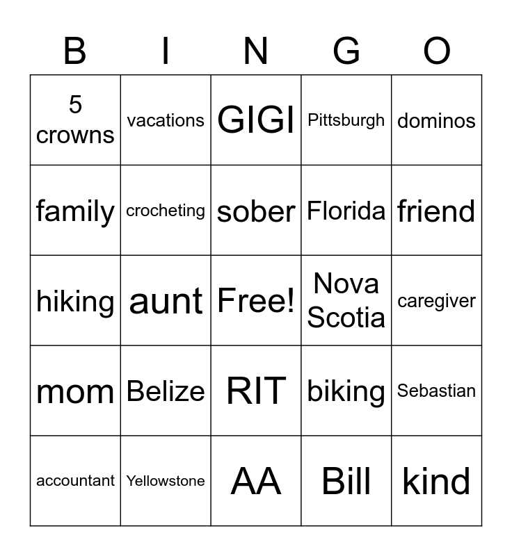 This bingo card has a free space and 24 words: Belize, Yellowstone, sober, accountant, dominos, 5 crowns, family, vacations, Nova Scotia, RIT, Florida, hiking, biking, Sebastian, crocheting, Bill, caregiver, GIGI, friend, aunt, kind, mom, Pittsburgh and AA.