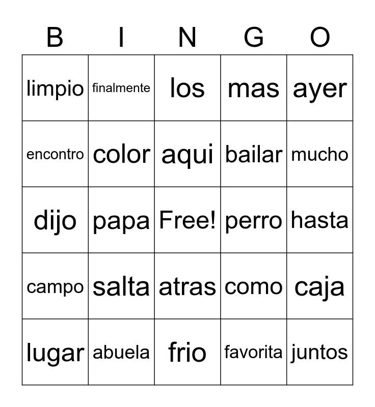 This bingo card has a free space and 24 words: salta, abuela, aqui, lugar, ayer, limpio, encontro, finalmente, perro, atras, bailar, dijo, como, caja, color, favorita, hasta, los, mucho, papa, juntos, campo, mas and frio.
