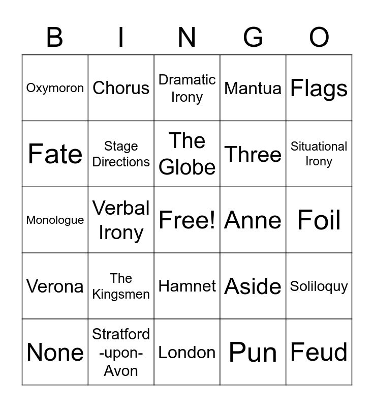 This bingo card has a free space and 24 words: The Kingsmen, Stratford -upon-Avon, The Globe, None, Flags, Oxymoron, Fate, Chorus, Anne, Hamnet, Three, Monologue, Aside, Soliloquy, Stage Directions, Pun, Foil, Dramatic Irony, Situational Irony, Verbal Irony, Feud, Verona, Mantua and London.