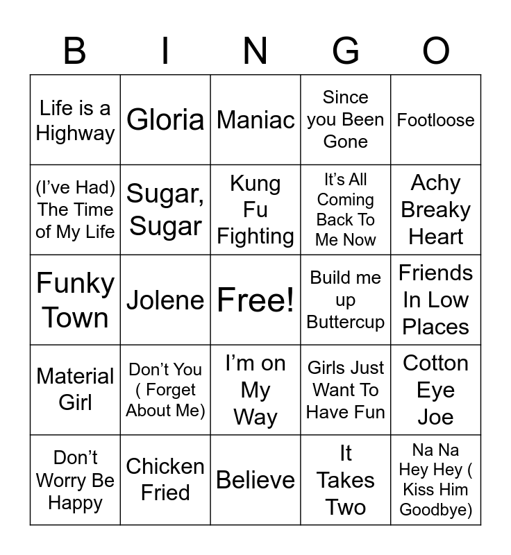 This bingo card has a free space and 73 words: Ain’t No Mountain High Enough, Dancing Queen, Life is a Highway, I Wanna Dance with Somebody ( who loves me), Never Gonna Give You Up, Kiss, Material Girl, Billie Jean, Girls Just Want To Have Fun, Respect, Before He Cheats, Lean on Me, Sugar, Sugar, Friends In Low Places, Love Shack, Gloria, Believe, (I’ve Had) The Time of My Life, Celebration, Build me up Buttercup, Kung Fu Fighting, Since you Been Gone, Footloose, La Bamba, Don’t Worry Be Happy, Everybody Needs Somebody to Love, Superstition, Can’t Fight This Feeling, This Is How We Do It, Sweet Dreams ( Are made of this ), Chicken Fried, Livin’ la Vida Loca, My Girl, I’m Like A Bird, Jolene, Don’t You Want Me, It’s Five o’clock Somewhere, In the Summertime, Na Na Hey Hey ( Kiss Him Goodbye), Copa Cabana, It Takes Two, Don’t You ( Forget About Me), U Can't Touch This, … Baby one More Time, Bust A Move, It’s All Coming Back To Me Now, Maniac, What Is Love, Hung Up, Funky Town, September, Oh, Pretty Woman, It’s Not Unusual, I Got You ( I Feel Good), Rockin’ Robin, I want Candy, You Make My Dreams Come True, I’m on My Way, P.Y.T ( Pretty Young Thing), Ring of Fire, I’m Still Standing, Pocketful Of Sunshine, Escape ( The piña Colada Song ), Achy Breaky Heart, Wake Me Up Before You Go-Go, Don't Go Breaking My Heart, Black or White, Brown Eyed Girl, Cotton Eye Joe, Ob-La-Di, Ob-La-Da, Burning Love, Baby and We Are Young( Feat Janelle Monae).