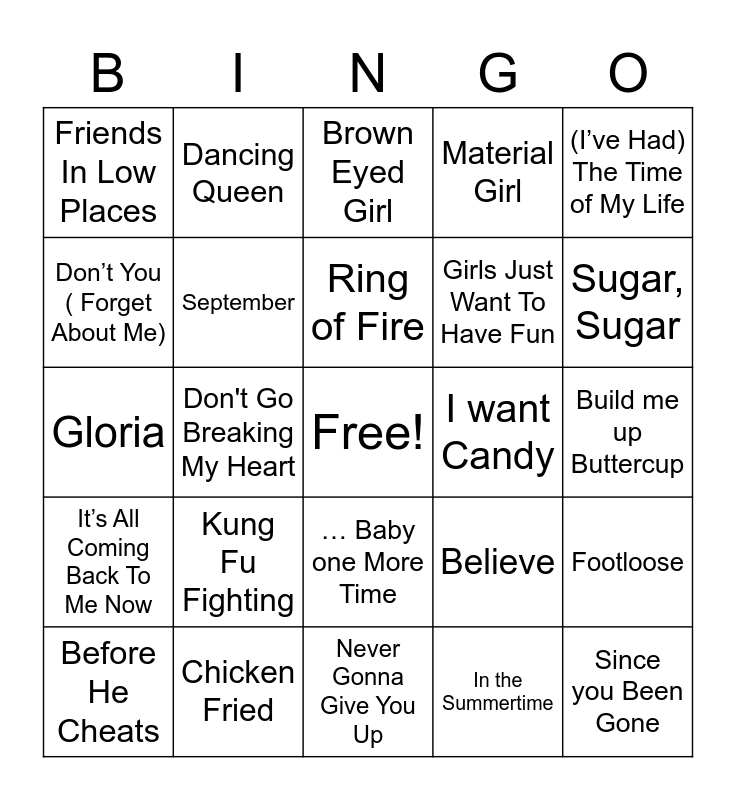 This bingo card has a free space and 71 words: Ain’t No Mountain High Enough, Dancing Queen, Life is a Highway, I Wanna Dance with Somebody ( who loves me), Never Gonna Give You Up, Kiss, Material Girl, Billie Jean, Girls Just Want To Have Fun, Respect, Before He Cheats, Lean on Me, Sugar, Sugar, Friends In Low Places, Love Shack, Gloria, Believe, (I’ve Had) The Time of My Life, Celebration, Build me up Buttercup, Kung Fu Fighting, Since you Been Gone, Footloose, La Bamba, Don’t Worry Be Happy, Everybody Needs Somebody to Love, Superstition, Can’t Fight This Feeling, This Is How We Do It, Sweet Dreams ( Are made of this ), Chicken Fried, Livin’ la Vida Loca, My Girl, I’m Like A Bird, In the Summertime, Na Na Hey Hey ( Kiss Him Goodbye), Copa Cabana, It Takes Two, Don’t You ( Forget About Me), U Can't Touch This, … Baby one More Time, Bust A Move, It’s All Coming Back To Me Now, Maniac, What Is Love, Hung Up, Funky Town, September, Oh, Pretty Woman, It’s Not Unusual, I Got You ( I Feel Good), Rockin’ Robin, I want Candy, You Make My Dreams Come True, I’m on My Way, P.Y.T ( Pretty Young Thing), Ring of Fire, I’m Still Standing, Pocketful Of Sunshine, Escape ( The piña Colada Song ), Achy Breaky Heart, Wake Me Up Before You Go-Go, Don't Go Breaking My Heart, Black or White, Don’t Stop Believin, What I Like About You, Brown Eyed Girl, Cotton Eye Joe, Ob-La-Di, Ob-La-Da, Burning Love and Baby.