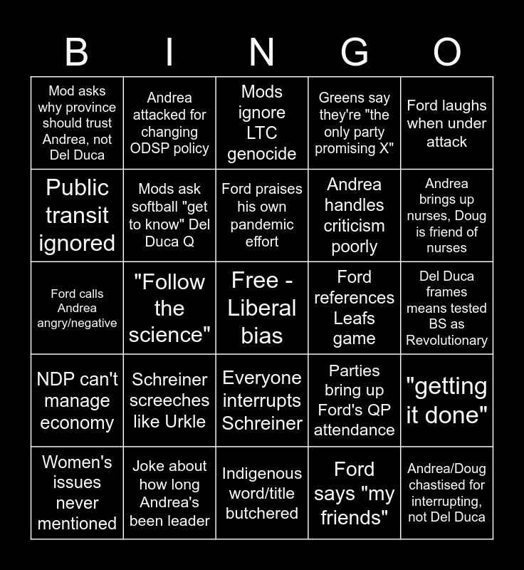 This bingo card has a free space and 24 words: Schreiner screeches like Urkle, Joke about how long Andrea's been leader, Ford praises his own pandemic effort, Women's issues never mentioned, Ford laughs when under attack, Mod asks why province should trust Andrea, not Del Duca, Public transit ignored, Andrea attacked for changing ODSP policy, Ford references Leafs game, Everyone interrupts Schreiner, Andrea handles criticism poorly, Ford calls Andrea angry/negative, Parties bring up Ford's QP attendance, "getting it done", Mods ask softball "get to know" Del Duca Q, Ford says "my friends", Del Duca frames means tested BS as Revolutionary, Mods ignore LTC genocide, Andrea brings up nurses, Doug is friend of nurses, "Follow the science", Andrea/Doug chastised for interrupting, not Del Duca, NDP can't manage economy, Greens say they're "the only party promising X" and Indigenous word/title butchered.