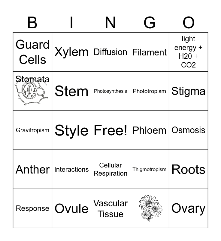 This bingo card has 2 images, a free space and 24 words: Interactions, Vascular Tissue, Photosynthesis, Response, light energy + H20 + CO2, Guard Cells, Stomata, Xylem, Phloem, Cellular Respiration, Phototropism, Gravitropism, Thigmotropism, Roots, Stem, Shoot, Osmosis, Diffusion, Stigma, Style, Ovary, Ovule, Anther and Filament.