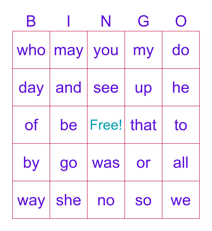 This bingo card has a free space and 25 words: go, no, see, way, do, who, day, may, that, was, up, of, or, all, and, the, to, you, he, be, we, she, by, my and so.