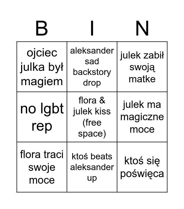 This bingo card has a free space and 8 words: julek ma magiczne moce, julek zabił swoją matke, aleksander sad backstory drop, flora traci swoje moce, ojciec julka był magiem, ktoś się poświęca, no lgbt rep and ktoś beats aleksander up.