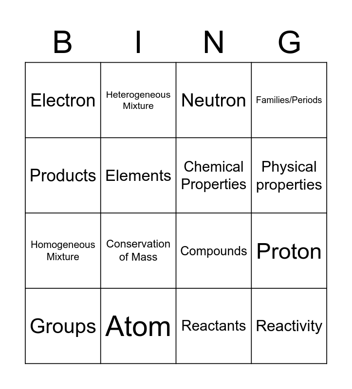 This bingo card has 16 words: Atom, Proton, Neutron, Electron, Homogeneous Mixture, Heterogeneous Mixture, Compounds, Reactants, Products, Elements, Groups, Families/Periods, Conservation of Mass, Physical properties, Chemical Properties and Reactivity.