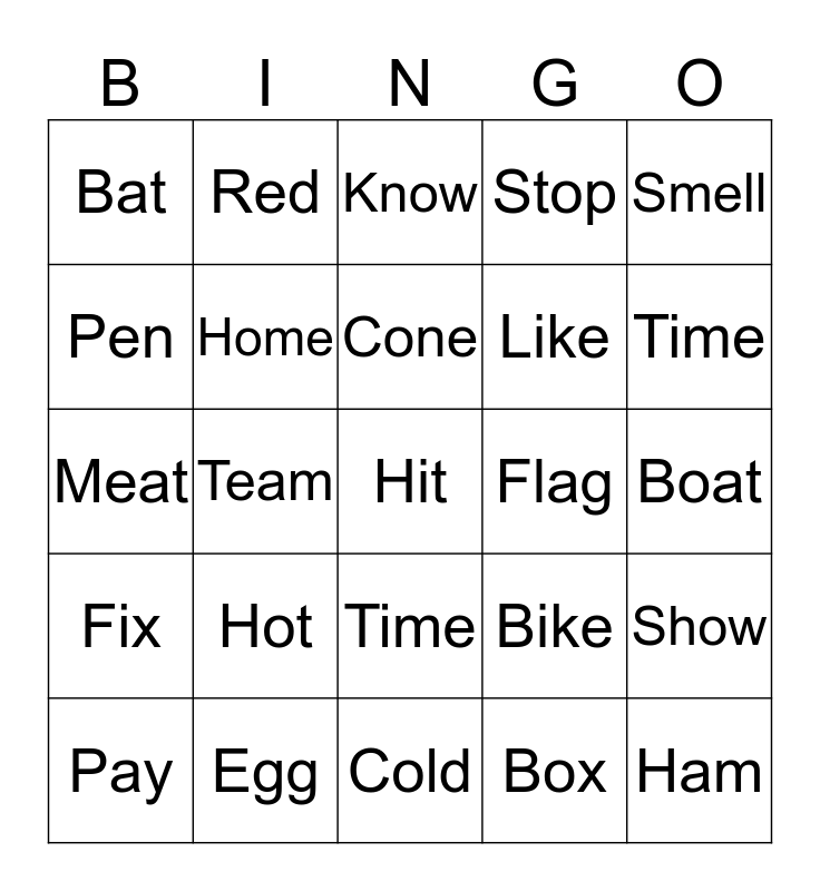 This bingo card has 34 words: Ham, Box, Truck, Rice, Fix, Home, Smell, Pay, Red, Night, Cone, Know, Rock, Lot, Flag, Time, Egg, Meat, Hot, Bike, Time, Feet, Bat, Boat, Cold, Hit, Stop, Try, Like, Pen, Hope, Team, Show and Job.