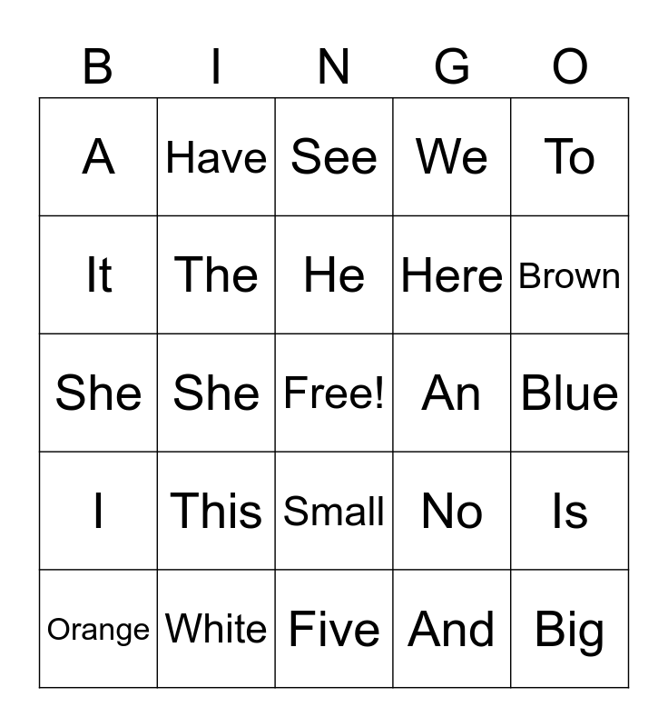 This bingo card has a free space and 24 words: This, White, He, Orange, To, A, It, Have, An, Small, Here, She, No, Is, The, And, Blue, See, Brown, She, Big, I, We and Five.