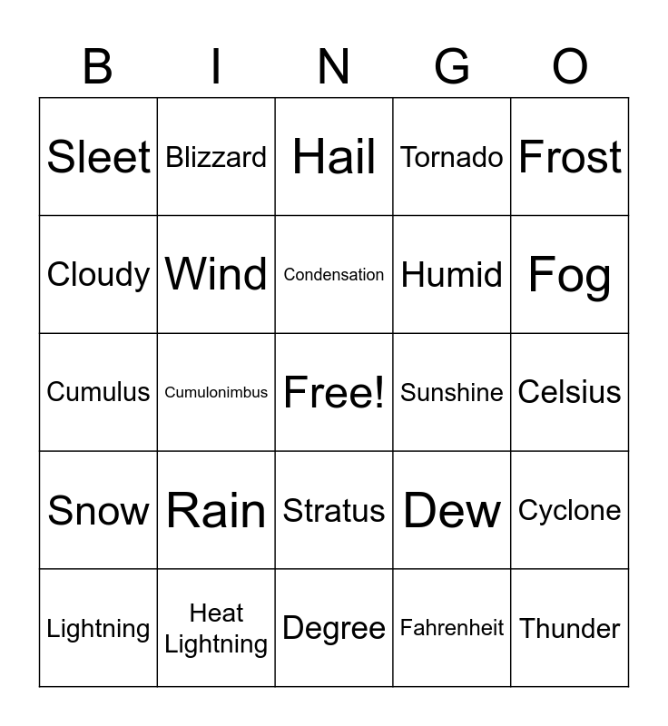 This bingo card has a free space and 24 words: Rain, Heat Lightning, Condensation, Lightning, Frost, Sleet, Cloudy, Blizzard, Sunshine, Stratus, Humid, Cumulus, Dew, Cyclone, Wind, Fahrenheit, Celsius, Hail, Fog, Cumulonimbus, Thunder, Snow, Tornado and Degree.