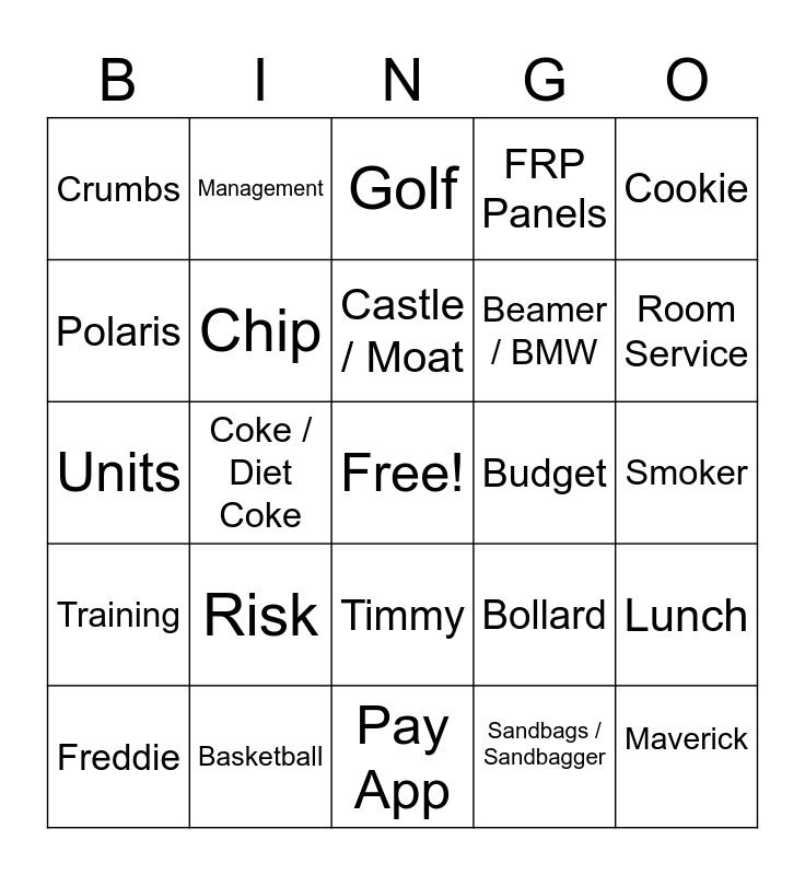 This bingo card has a free space and 24 words: Risk, Basketball, Castle / Moat, Freddie, Cookie, Crumbs, Polaris, Management, Budget, Timmy, Beamer / BMW, Units, Bollard, Lunch, Chip, Sandbags / Sandbagger, Smoker, Golf, Room Service, Coke / Diet Coke, Maverick, Training, FRP Panels and Pay App.