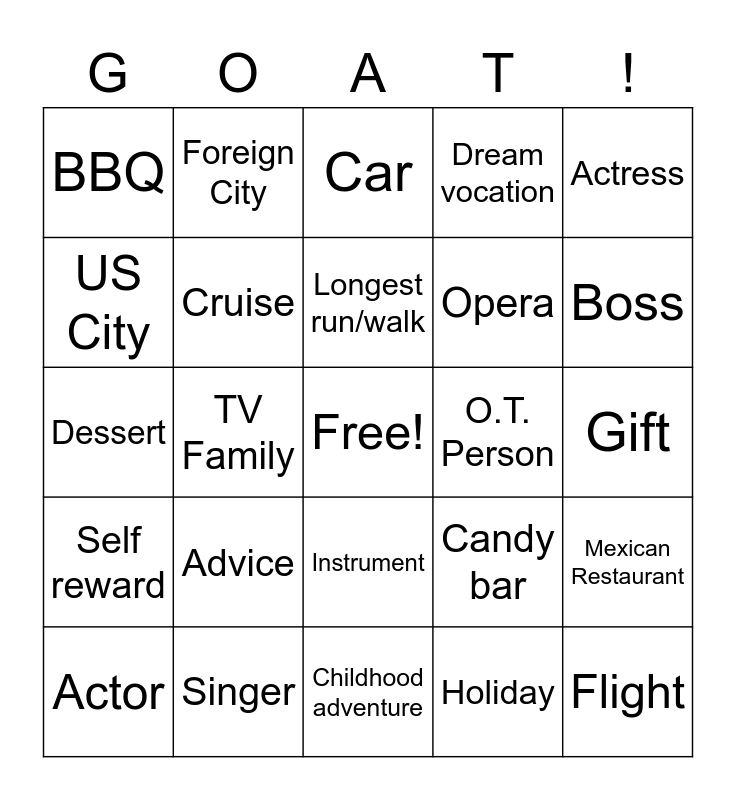 This bingo card has a free space and 24 words: Advice, Singer, Longest run/walk, Actor, Actress, BBQ, US City, Foreign City, O.T. Person, Instrument, Opera, Dessert, Candy bar, Mexican Restaurant, Cruise, Holiday, Gift, Car, Boss, TV Family, Flight, Self reward, Dream vocation and Childhood adventure.