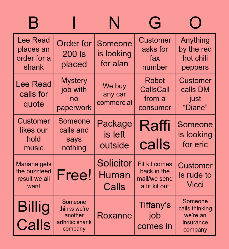 This bingo card has 25 words: Free!, Roxanne, We buy any car commercial, Billig Calls, Anything by the red hot chili peppers, Lee Read places an order for a shank, Lee Read calls for quote, Order for 200 is placed, Raffi calls, Solicitor Human Calls, Robot CallsCall from a consumer, Customer likes our hold music, Fit kit comes back in the mail/we send a fit kit out, Customer is rude to Vicci, Mystery job with no paperwork, Someone calls thinking we’re an insurance company, Someone is looking for eric, Someone is looking for alan, Customer calls DM just “Diane”, Someone calls and says nothing, Package is left outside, Someone thinks we’re another arthritic shank company, Mariana gets the buzzfeed result we all want, Customer asks for fax number and Tiffany’s job comes in.