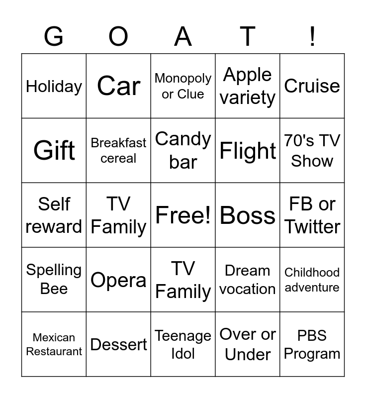 This bingo card has a free space and 24 words: Opera, Dessert, Candy bar, Mexican Restaurant, Cruise, Holiday, Gift, Car, Boss, TV Family, Flight, Self reward, Dream vocation, Childhood adventure, Breakfast cereal, Over or Under, FB or Twitter, Monopoly or Clue, 70's TV Show, TV Family, PBS Program, Spelling Bee, Apple variety and Teenage Idol.