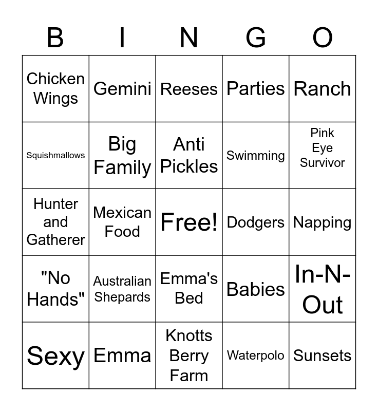 This bingo card has a free space and 49 words: Pink, Rex, Pig Auction, Waterpolo, Napping, Grindstaff, Gemini, iPad, Swimming, Beach, Squishmallows, Mexican Food, Babies, Sunsets, Taylor Swift, Bojack, Reeses, Dodgers, Pimp, Chicken Wings, Emma, Knotts Berry Farm, Parties, Ranch, Frat Rat, Australian Shepards, Anti Pickles, King City, In-N-Out, "No Hands", Dogs, Emma's Bed, DLG, Long Beach, Sexy, "Bruh", "Ugh", "Oh God", Pink Eye Survivor, Pitbull's Fireball, Vans, Chef, Can Thrower, Mayhem Causer, Hunter and Gatherer, Big Family, Mr. Frog, "I have to go to the bathroom" and Tiktok.