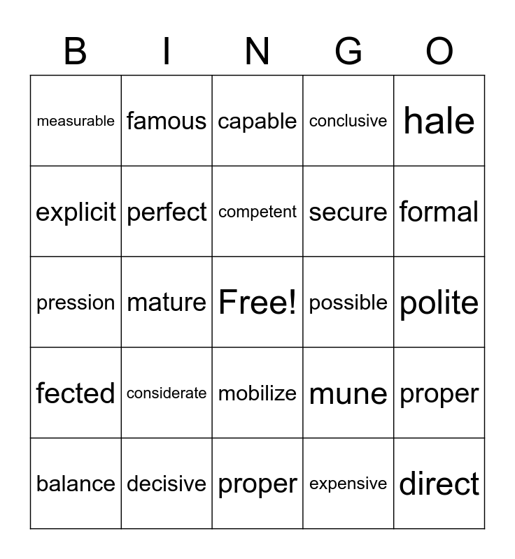 This bingo card has a free space and 29 words: balance, accurate, mature, active, measurable, capable, perfect, considerate, possible, decisive, polite, direct, proper, expensive, formal, mersed, mobilize, fected, hale, pression, mune, mortal, secure, explicit, conclusive, famous, proper, competent and sane.