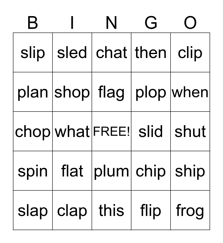 This bingo card has a free space and 24 words: flat, clap, flag, slap, clip, slip, plan, sled, slid, plum, plop, chop, chip, ship, shop, flip, shut, chat, when, what, frog, spin, then and this.