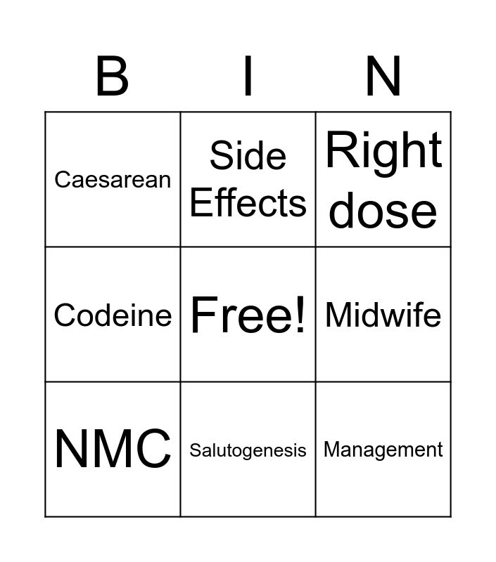 This bingo card has a free space and 26 words: Bushra, Breastfeeding, Salutogenesis, Support, Management, Caesarean, Midwife, Side Effects, Paracetamol, Education, Pain relief, Heparin, Antibiotics, Diclofenac, Uterotonic, Labetalol, Codeine, Sense of Coherence, Right dose, Right Patient, Right Route, BFN, Oxytocin, Thromboprophylaxis, NMC and Consent.
