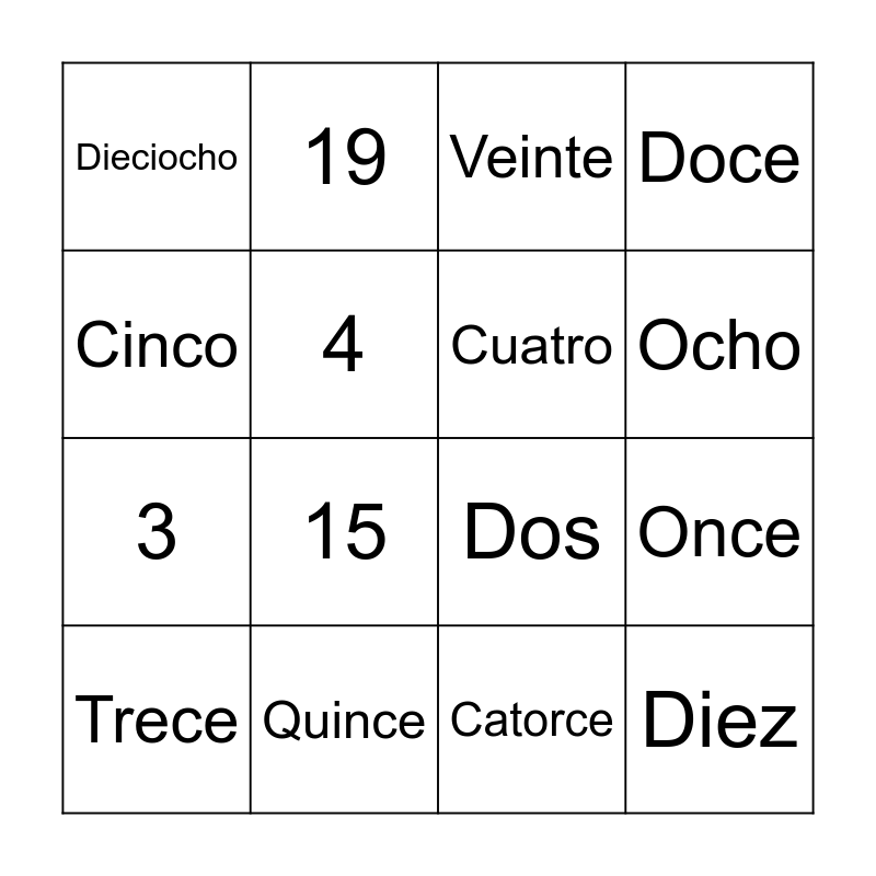 This bingo card has 40 words: Uno, Dos, Tres, Cuatro, Seis, Siete, Ocho, Nueve, Cinco, Diez, Once, Doce, Trece, Catorce, Quince, Dieciséis, Diecisiete, Dieciocho, Diecinueve, Veinte, 1, 2, 3, 4, 5, 6, 7, 8, 9, 10, 11, 12, 13, 14, 15, 16, 17, 18, 19 and 20.
