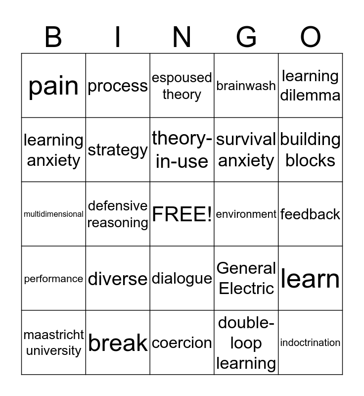 This bingo card has a free space and 32 words: double-loop learning, learning organization, defensive reasoning, Schein, performance, strategy, learning dilemma, learn, process, single-loop learning, theory-in-use, espoused theory, mental map, doom loop, environment, leadership, maastricht university, multidimensional, dialogue, diverse, General Electric, reflection, feedback, break, indoctrination, brainwash, survival anxiety, learning anxiety, pain, coercion, war and building blocks.