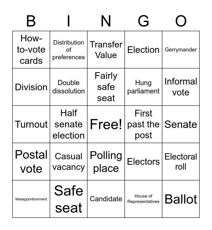 This bingo card has a free space and 46 words: Absolute majority, Ballot, By-election, Candidate, Casual vacancy, Democracy, Distribution of preferences, Dis-endorsed candidate, Division, Donkey vote, Double dissolution, Election, Electoral roll, Electors, Franchise, Enrolment rate, Fairly safe seat, First past the post, Formal vote, Gerrymander, Half senate election, House of Representatives, How-to-vote cards, Hung parliament, Independents, Informal vote, Malapportionment, Marginal seat, Polling place, Postal vote, Preferential voting, Proportional representation, Preselection, Quota – Senate, Redistribution, Safe seat, Senate, Secret ballot, Surplus, Swing, Swinging voter, Transfer Value, Turnout, Two-party-preferred (TPP) count, Two-candidate-preferred (TCP) count and Writ.