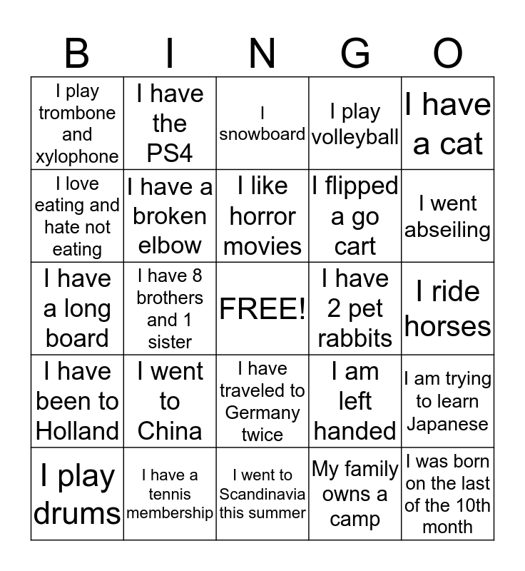 This bingo card has a free space and 24 words: I went to China, I have a tennis membership, I like horror movies, I play drums, I have a cat, I play trombone and xylophone, I love eating and hate not eating, I have the PS4, I have 2 pet rabbits, I have traveled to Germany twice, I flipped a go cart, I have a long board, I am left handed, I am trying to learn Japanese, I have a broken elbow, My family owns a camp, I ride horses, I snowboard, I went abseiling, I have 8 brothers and 1 sister, I was born on the last of the 10th month, I have been to Holland, I play volleyball and I went to Scandinavia this summer.