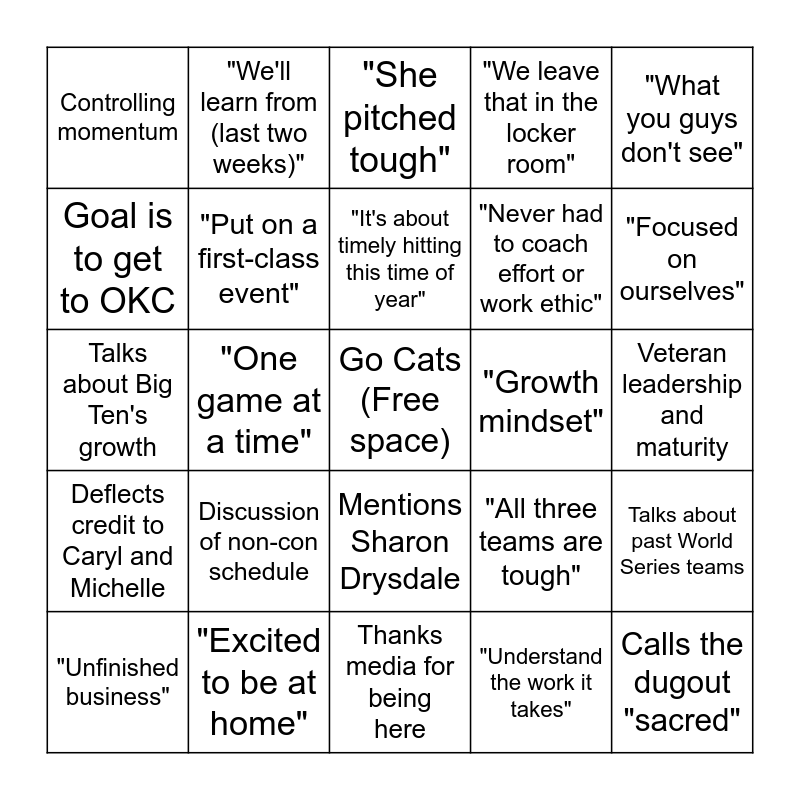 This bingo card has a free space and 24 words: Discussion of non-con schedule, "Excited to be at home", "It's about timely hitting this time of year", "Unfinished business", "What you guys don't see", Controlling momentum, Goal is to get to OKC, "We'll learn from (last two weeks)", "Growth mindset", Mentions Sharon Drysdale, "Never had to coach effort or work ethic", Talks about Big Ten's growth, "All three teams are tough", Talks about past World Series teams, "Put on a first-class event", "Understand the work it takes", Veteran leadership and maturity, "She pitched tough", "Focused on ourselves", "One game at a time", Calls the dugout "sacred", Deflects credit to Caryl and Michelle, "We leave that in the locker room" and Thanks media for being here.
