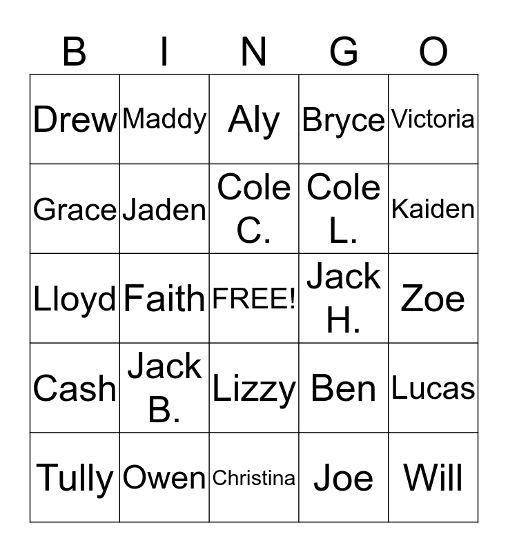 This bingo card has a free space and 24 words: Jack B., Owen, Cole C., Tully, Victoria, Drew, Grace, Maddy, Jack H., Lizzy, Cole L., Lloyd, Ben, Lucas, Jaden, Joe, Zoe, Aly, Kaiden, Faith, Will, Cash, Bryce and Christina.