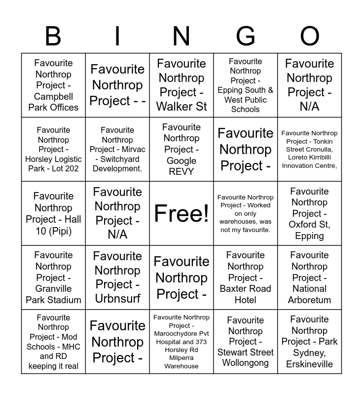 This bingo card has a free space and 28 words: Favourite Northrop Project - National Arboretum, Favourite Northrop Project - Nil so far, Favourite Northrop Project -, Favourite Northrop Project - Stewart Street Wollongong, Favourite Northrop Project - Horsley Logistic Park - Lot 202, Favourite Northrop Project - Walker St, Favourite Northrop Project - -, Favourite Northrop Project - Granville Park Stadium, Favourite Northrop Project - Worked on only warehouses, was not my favourite., Favourite Northrop Project - Mod Schools - MHC and RD keeping it real, Favourite Northrop Project - Hall 10 (Pipi), Favourite Northrop Project - Epping South & West Public Schools, Favourite Northrop Project -, Favourite Northrop Project - Maroochydore Pvt Hospital and 373 Horsley Rd Milperra Warehouse, Favourite Northrop Project - Tonkin Street Cronulla, Loreto Kirribilli Innovation Centre,, Favourite Northrop Project - Heffron Centre, Favourite Northrop Project - Urbnsurf, Favourite Northrop Project - Mirvac - Switchyard Development., Favourite Northrop Project - Google REVY, Favourite Northrop Project -, Favourite Northrop Project - Campbell Park Offices, Favourite Northrop Project - Sunny Coast, Favourite Northrop Project - Park Sydney, Erskineville, Favourite Northrop Project - N/A, Favourite Northrop Project - Oxford St, Epping, Favourite Northrop Project - Baxter Road Hotel, Favourite Northrop Project - N/A and Favourite Northrop Project - Despite the challenges.... Bridge St.