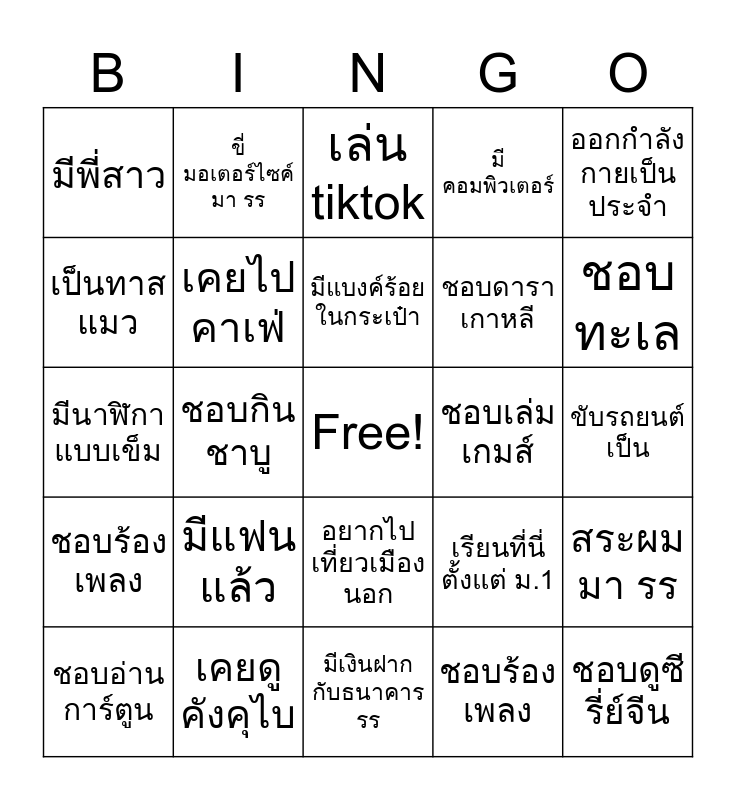 This bingo card has a free space and 24 words: มีแฟนแล้ว, เคยดูคังคุไบ, มีแบงค์ร้อยในกระเป๋า, ชอบอ่านการ์ตูน, ออกกำลังกายเป็นประจำ, มีพี่สาว, เป็นทาสแมว, ขี่มอเตอร์ไซค์มา รร, ชอบเล่มเกมส์, อยากไปเที่ยวเมืองนอก, ชอบดาราเกาหลี, มีนาฬิกาแบบเข็ม, เรียนที่นี่ตั้งแต่ ม.1, สระผมมา รร, เคยไปคาเฟ่, ชอบร้องเพลง, ขับรถยนต์เป็น, เล่น tiktok, ชอบทะเล, ชอบกินชาบู, ชอบดูซีรี่ย์จีน, ชอบร้องเพลง, มีคอมพิวเตอร์ and มีเงินฝากกับธนาคาร รร.