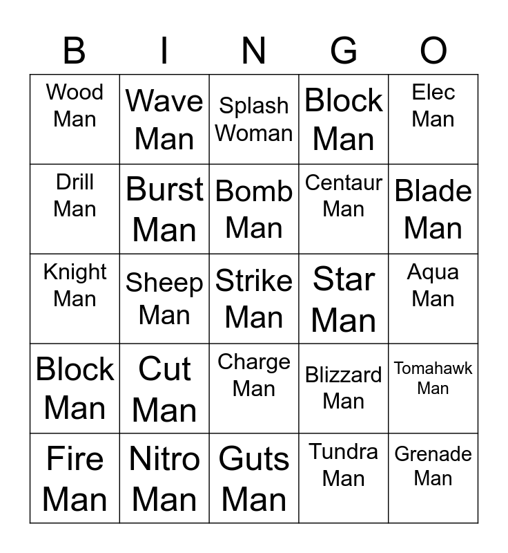 This bingo card has 25 words: Cut Man, Guts Man, Bomb Man, Fire Man, Elec Man, Wood Man, Drill Man, Wave Man, Star Man, Charge Man, Centaur Man, Knight Man, Blizzard Man, Tomahawk Man, Burst Man, Grenade Man, Aqua Man, Splash Woman, Blade Man, Sheep Man, Strike Man, Nitro Man, Block Man, Block Man and Tundra Man.