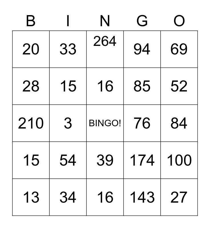 This bingo card has a free space and 24 words: 13, 54, 16, 143, 69, 20, 33, 264, 76, 84, 210, 15, 174, 100, 28, 34, 16, 94, 52, 15, 3, 39, 85 and 27.