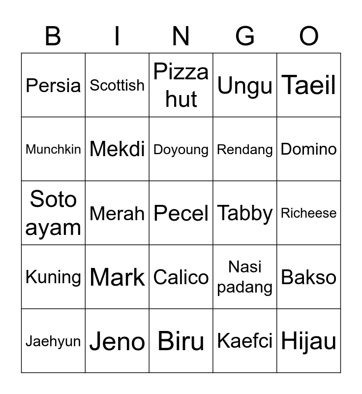 This bingo card has a free space and 24 words: Mark, Jeno, Doyoung, Jaehyun, Taeil, Persia, Munchkin, Scottish, Tabby, Calico, Rendang, Soto ayam, Nasi padang, Bakso, Mekdi, Kaefci, Richeese, Pizza hut, Domino, Merah, Hijau, Kuning, Ungu and Biru.