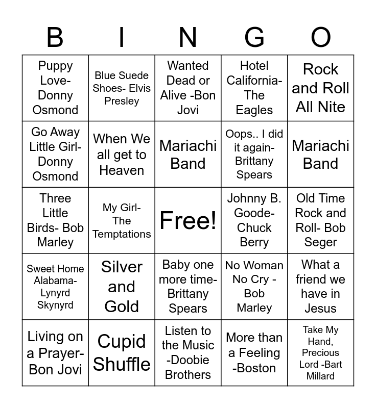 This bingo card has a free space and 24 words: Silver and Gold, Cupid Shuffle, Mariachi Band, Living on a Prayer- Bon Jovi, Rock and Roll All Nite, Puppy Love- Donny Osmond, Go Away Little Girl- Donny Osmond, Blue Suede Shoes- Elvis Presley, Johnny B. Goode- Chuck Berry, Baby one more time- Brittany Spears, Oops.. I did it again- Brittany Spears, Three Little Birds- Bob Marley, No Woman No Cry -Bob Marley, What a friend we have in Jesus, When We all get to Heaven, More than a Feeling -Boston, Old Time Rock and Roll- Bob Seger, Wanted Dead or Alive -Bon Jovi, Mariachi Band, My Girl- The Temptations, Take My Hand, Precious Lord -Bart Millard, Sweet Home Alabama- Lynyrd Skynyrd, Hotel California- The Eagles and Listen to the Music -Doobie Brothers.