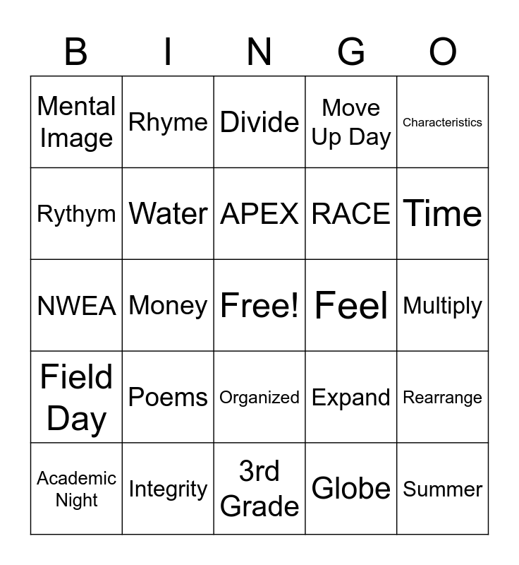 This bingo card has a free space and 24 words: Poems, Integrity, APEX, Academic Night, Characteristics, Mental Image, Rythym, Rhyme, Feel, Organized, RACE, NWEA, Expand, Rearrange, Water, Globe, Multiply, Divide, Time, Money, Summer, Field Day, Move Up Day and 3rd Grade.